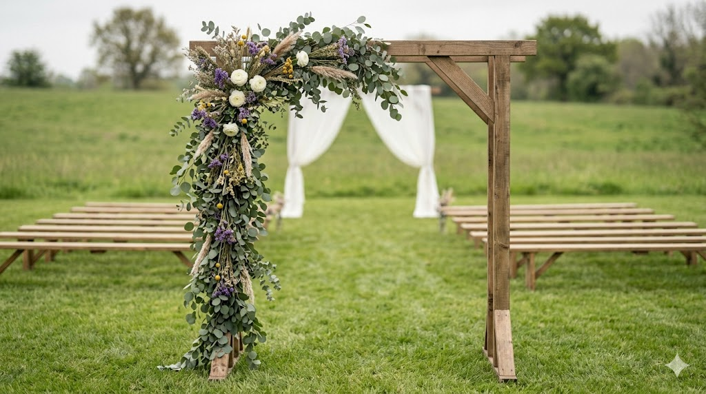 A raw timber arch ($60–$120 on Amazon, search “natural wood wedding arch”) is your ceremony anchor. Dress the top-left and bottom-right corners with cascading eucalyptus garland ($22–$38 for 6 feet on Afloral), loose dried wildflower bundles, and three to five stems of fresh white ranunculus from your local grocery store the day before. Asymmetric and intentional — not symmetrically stuffed with flowers. That asymmetry is what makes it look elevated.